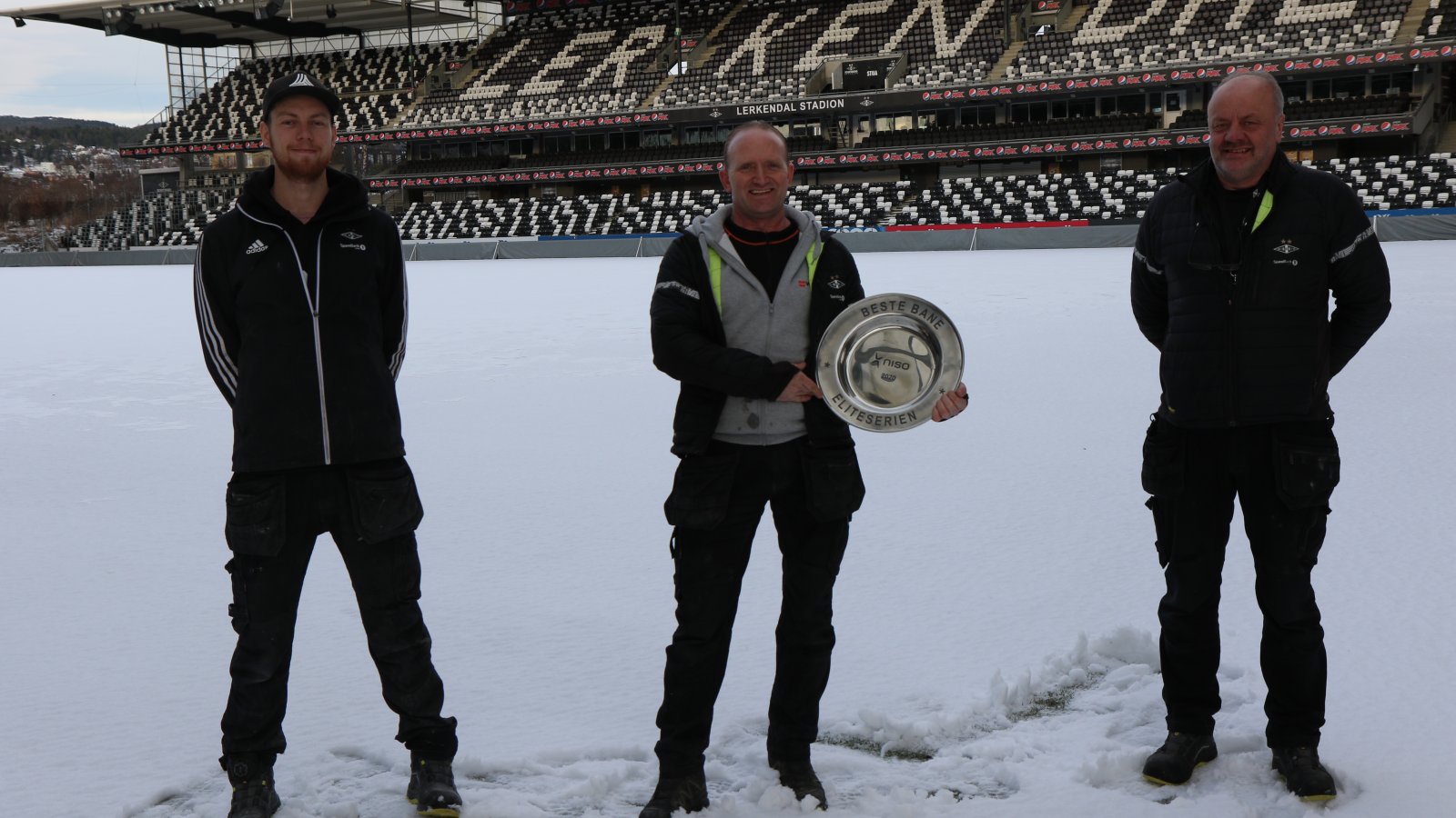 Verdig vinnere i banemannskapet viser frem premien. Fra venstre Martin Tinnen, Anders Øien og Per Haugnes.